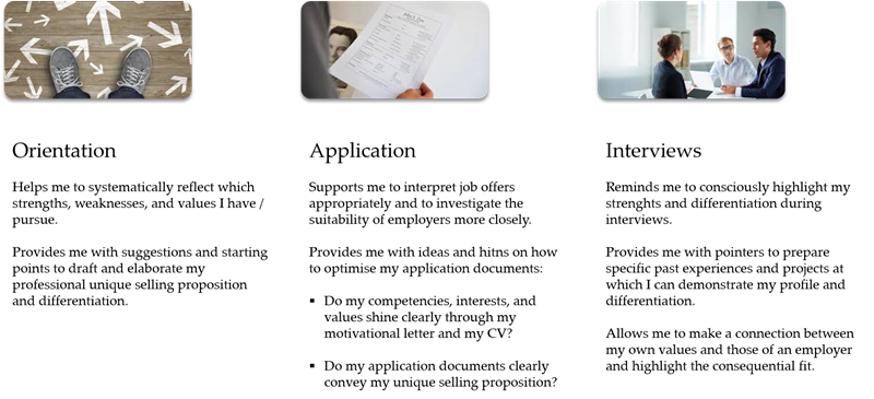 Another great benefit for participants is that you will receive a personal evaluation report after participating in the survey (view the example report). Based on the information you provide, this report will present the results in three different ways – along with a comparison group. The graphs and comparison data will allow you to study a summary of the information provided by you systematically and from different perspectives. While you are reviewing these findings, try to stay detached and objective: The Career Profiler is not meant to provide ready-made answers but rather a basis for structured reflection. Some results will seem more relatable to you than others. If this is the case: Consider the differences you perceive and draw your own conclusions. Once you have studied the evaluation report in this manner, you will be in a much better position to answer key questions about your unique selling points as a professional. This will enable to design job applications that highlight your strengths and to apply for and choose the jobs that are right for you.